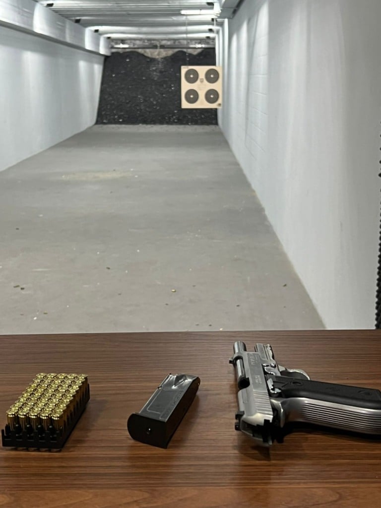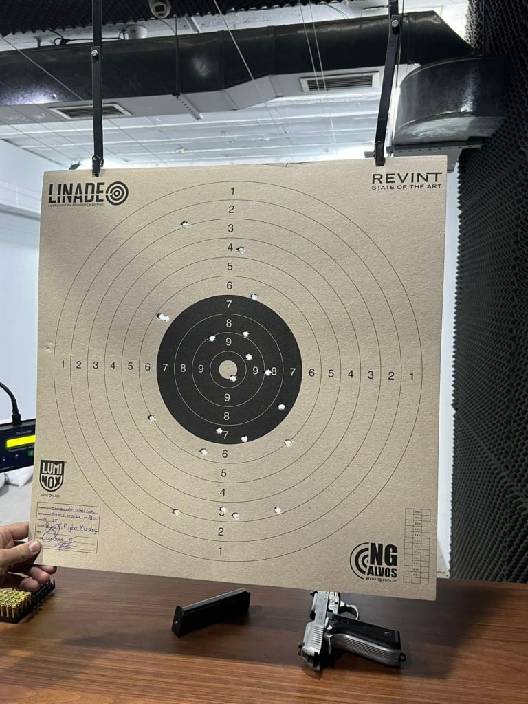 O carregador estava com cinco munições 9mm CBC ETOG, que adquiri no clube. Para cada centro, eram cinco disparos. O “X”, como um ponto branco, facilitava a visualização para cada acerto “na mosca”, que iam se concretizando. Comecei a esperar um resultado minimamente aceitável. Não é permitido trazer o alvo de volta a fim de ver os acertos. E quando ele volta, ao final, o atirador não pode tocá-lo, só o instrutor de tiro.